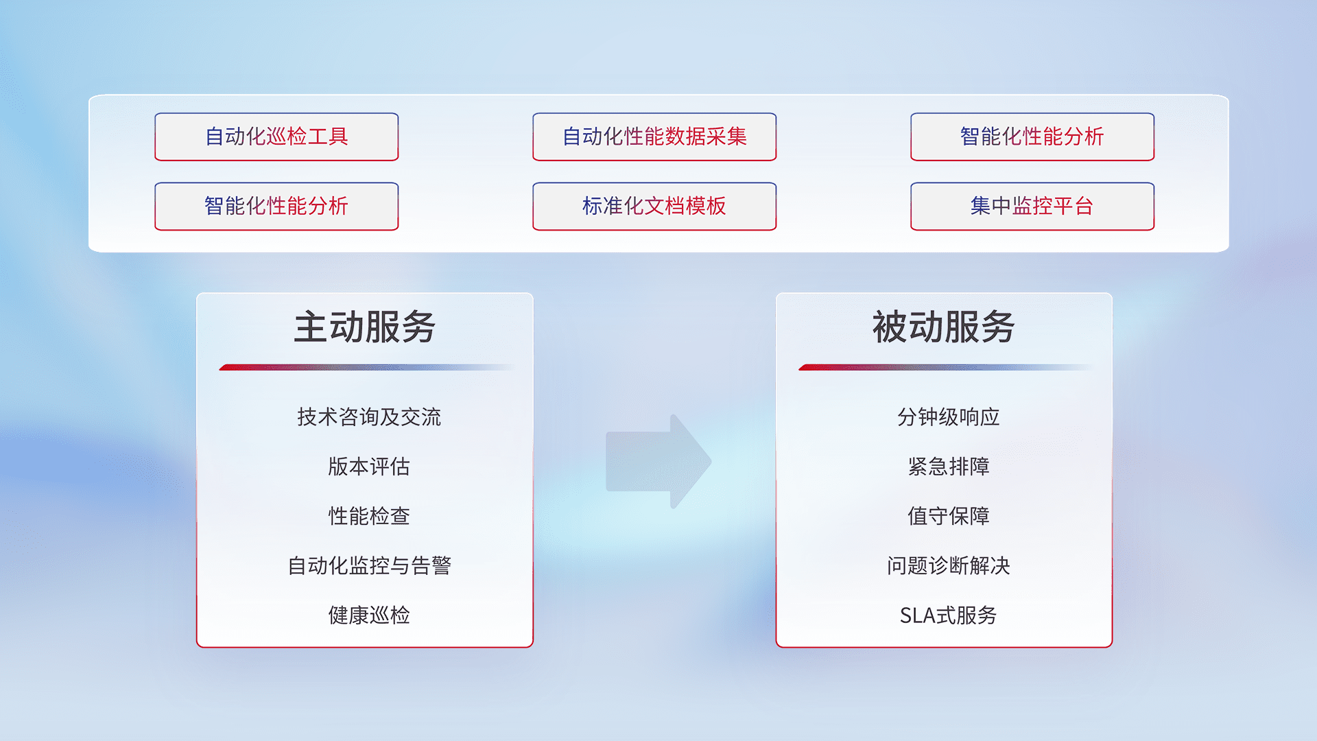 智能化工具和标准化文档,,,保障服务质量,,,,提供主动服务(包含技术咨询、、、版本评估、、性能检查、、自动化监控与告警、、、健康巡检)和被动服务包含(分钟级响应、、、紧急排障、、、值守保障、、、问题诊断解决、、、SLA服务)。。。